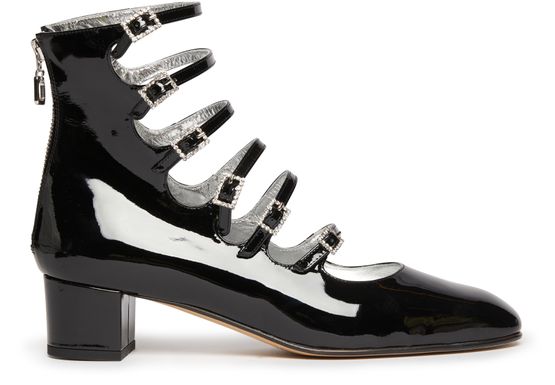 • Description : Pumps, square heel, buckled strap, high-top upper, patent leather.