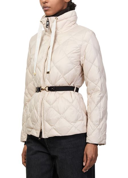 Reveal Max Mara's zip-up puffer jacket, crafted from smooth leather with a diamond pattern and padded texture. The short, long-sleeved silhouette features a high neck and zipper closure, finished with topstitched edges. Lined for comfort, this versatile piece transitions seamlessly from casual to elevated looks.