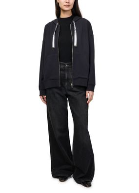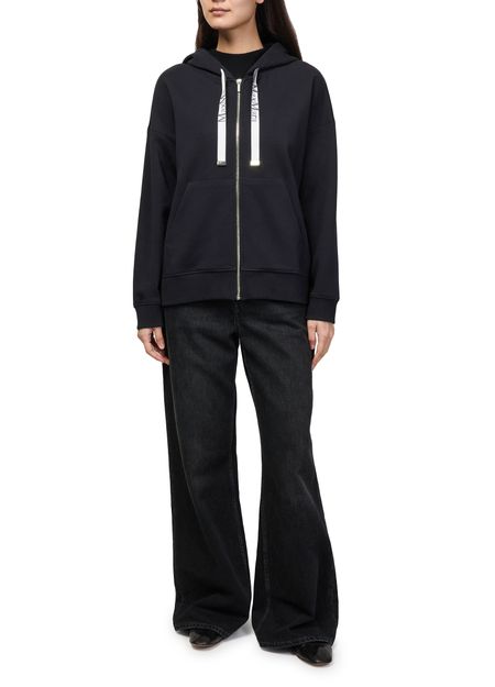 Reveal S Max Mara's zippered hoodie, featuring a crew neck with an adjustable drawstring and long sleeves for a sleek silhouette. The embroidered front logo and kangaroo pocket add modern flair, while the zipper closure ensures effortless layering for versatile, everyday style.