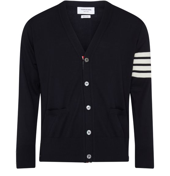 Thom Browne's 4-bar cardigan showcases a slim fit with a refined V-neck and long sleeves. Its buttoned fastening and cuffs enhance sophistication, while the brand's signature motif adds a touch of elegance. Front pockets offer practicality, and the ribbed texture ensures both style and comfort for any occasion.