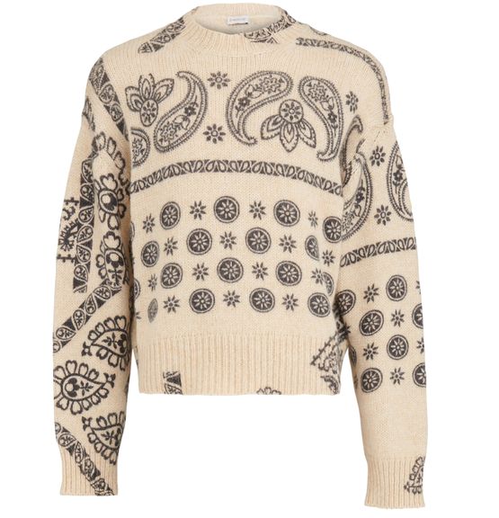 Description : Gender-neutral, crafted from a wool and alpaca blet, stocking-stitched, gauge 3, crew neck, long sleeves, ribbed neckline, cuffs and hem, digital print.