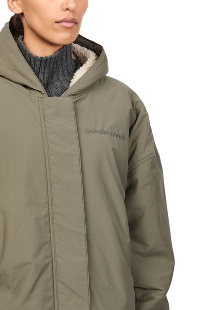 Embrace Canada Goose's Alberni reversible fleece aviator jacket, a perfect blend of style and functionality. This oversized, short jacket features a concealed closure, long sleeves, and a cozy hood. Side pockets and an embroidered logo add a touch of sophistication, making it versatile for any casual occasion.