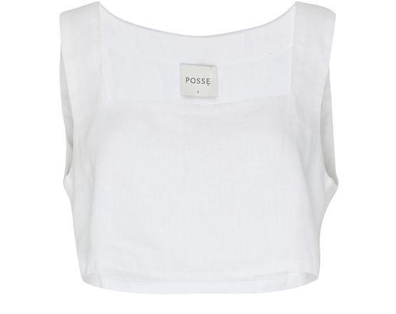 Introducing Posse's Alice crop top with a distinctive appliquéd logo. The visible stitching adds a modern touch to this crop, sleeveless blouse featuring a unique rectangular neckline.