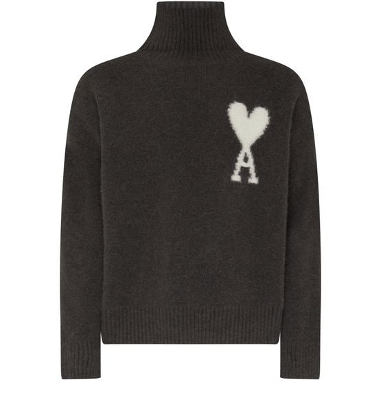 Ami de Cœur turtleneck sweater is a stylish knit sweater with a straight cut design. It features ribbed detailing for added texture and a rollneck/turtleneck collar for a touch of sophistication. With long sleeves and a chest logo, this sweater is a versatile piece for any wardrobe.