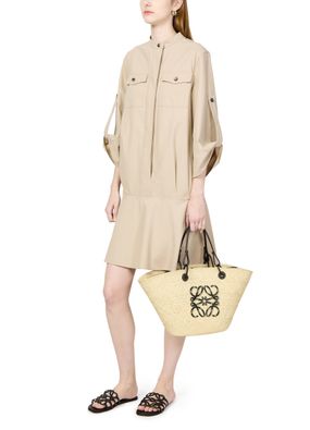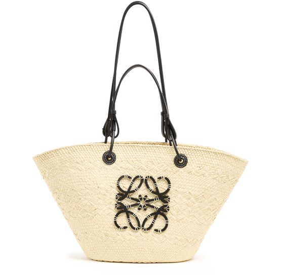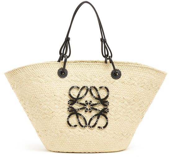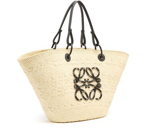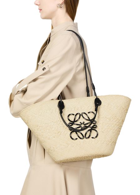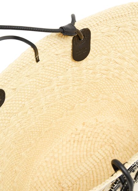 Loewe's Anagram basket is a blend of Iraca palm and calf leather, showcasing artisanal craftsmanship. It features a thin strap, double handles, and can be worn on the shoulder. The front logo adds a touch of sophistication to the simple design. The single compartment offers practicality, while the basket sizing and details may vary.