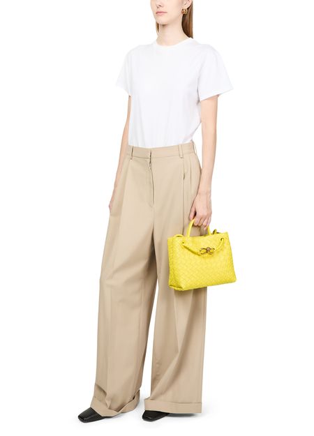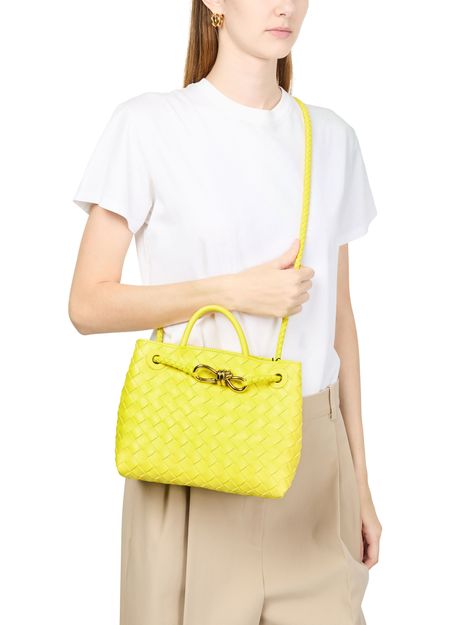 Crafted from smooth leather using the iconic Intrecciato weaving technique, Bottega Veneta's Andiamo small bag exudes timeless sophistication. With a handle and thin strap for versatile styling, it features a luxurious gold finish. This elegant bag can be hand-carried, worn on the shoulder, or across the body for effortless chic.