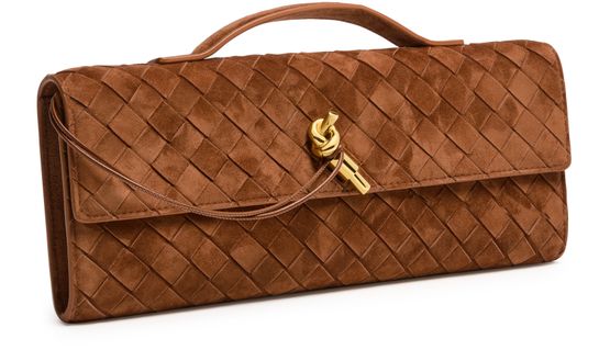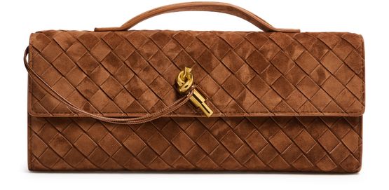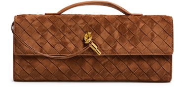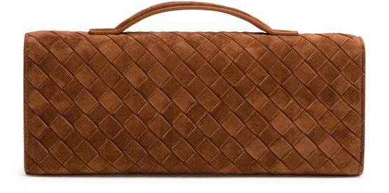 Reveal Bottega Veneta's suede toiletries bag, showcasing the iconic Intrecciato weaving technique. The gold finish and visible topstitching add refined detail, while a single handle and twist lock closure ensure both style and practicality. Interior slots for cards offer organized convenience for your essentials.