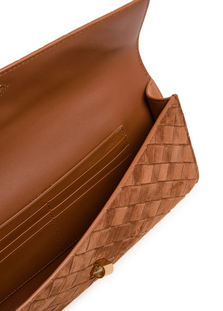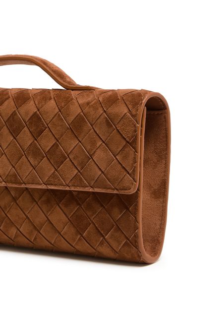 • Description : Toiletries bag / cosmetics pouch, intrecciato weaving technique, single handle, leather handle, suede, twist lock closure, visible topstitching, gold finish.