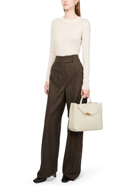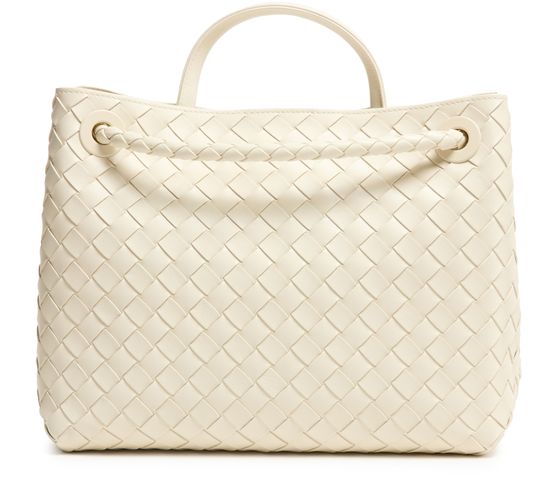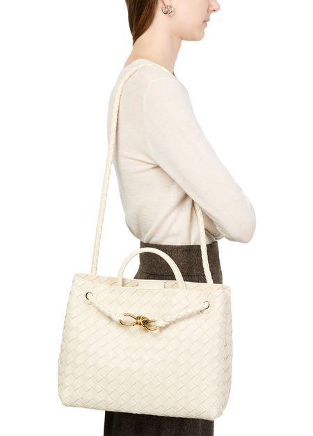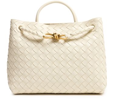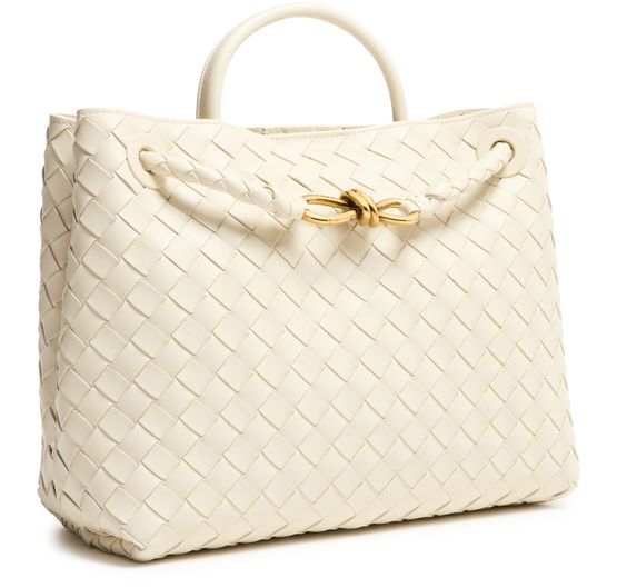 Bottega Veneta's Andiamo bag is crafted from smooth leather using the brand's iconic Intrecciato weaving technique. It features a practical handle, thin strap, and golden finish. Versatile and stylish, it can be hand carried, worn on the shoulder, or across the body, making it a perfect accessory for any occasion.