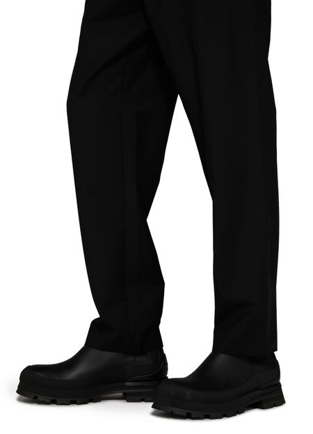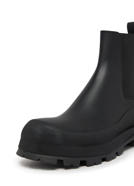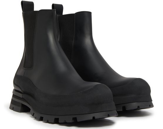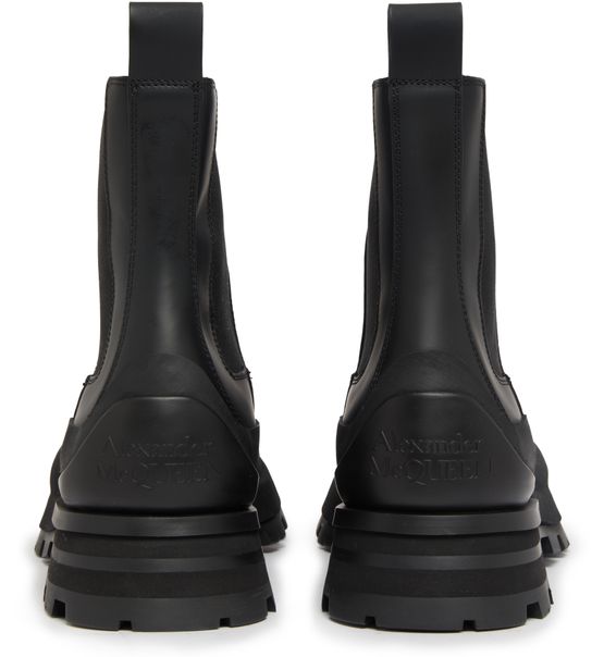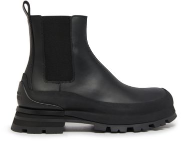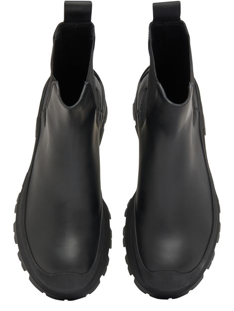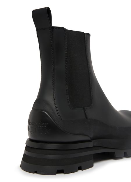 Alexander McQueen's ankle boots feature a round toe and closed design with a block heel for stylish comfort. The boots include the brand's logo at the back and a leather loop for easy slipping on and off. Elasticated sides ensure a snug fit, making them a timeless addition to any footwear collection.