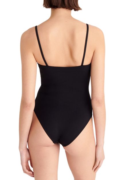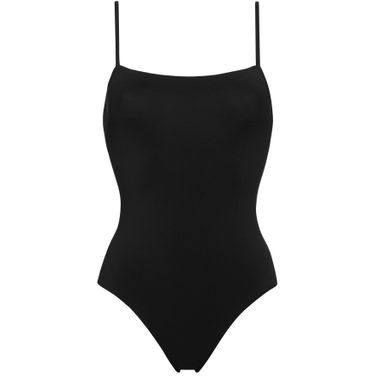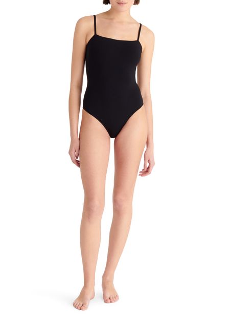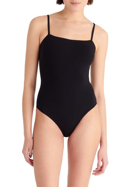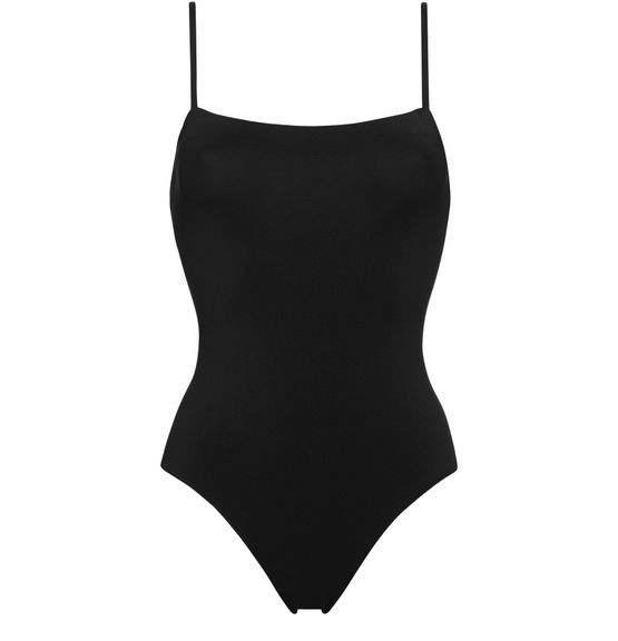 • Description : One-piece tank swimsuit, thin straps, wraparound neckline seam, straight back.