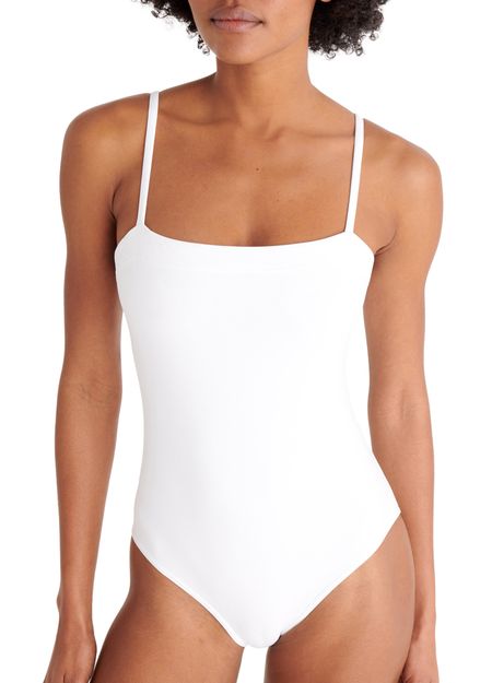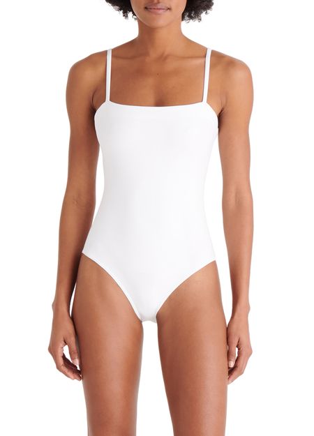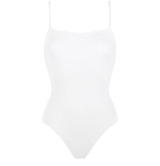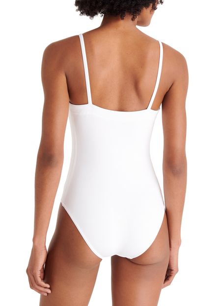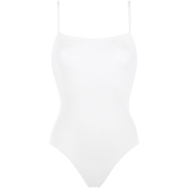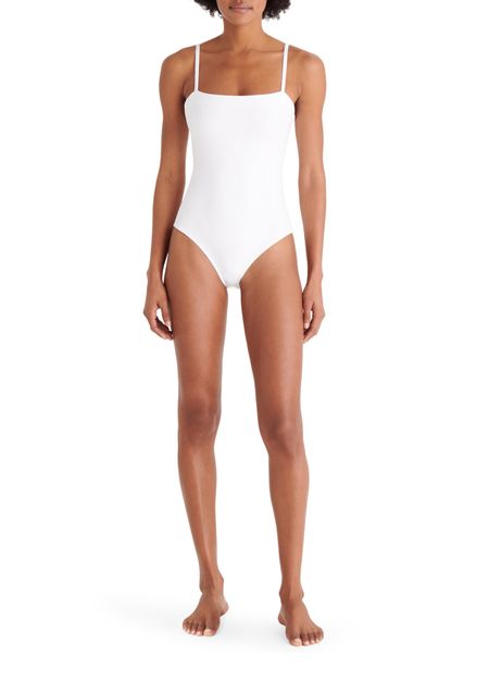 • Description : One-piece tank swimsuit, thin straps, wraparound neckline seam, straight back.