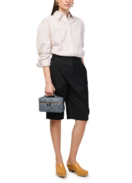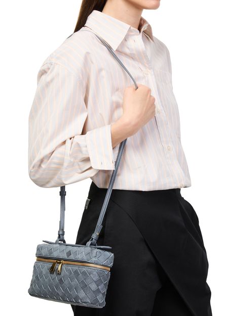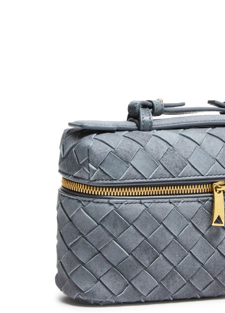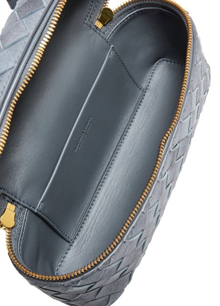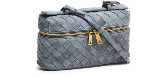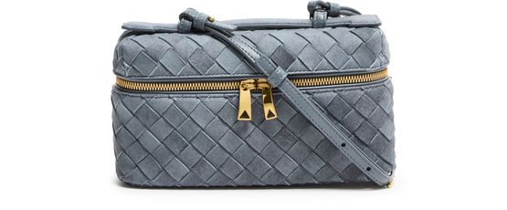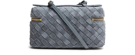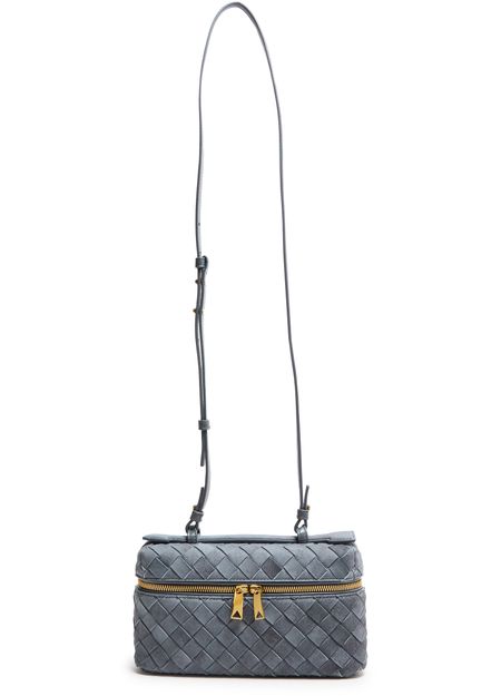 Reveal Bottega Veneta's Bang Bang vanity case, crafted in sumptuous suede with the iconic Intrecciato weaving technique. The adjustable thin strap and gold finish add a refined touch, while the spacious interior and multiple pockets ensure both elegance and practicality for your essentials.