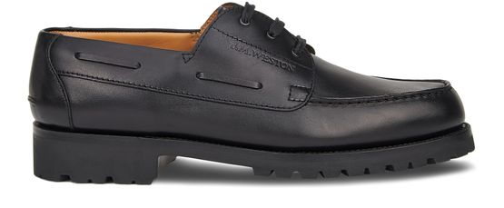 JM Weston's Bateau derbies showcase elegant lace-up shoes crafted from smooth leather. With a round toe and logo embossed on the side, they exude sophistication. Visible stitching adds character, while the logo-printed insole ensures comfort. The thick, notched sole and heel cushion provide support for all-day wear, blending style with practicality.