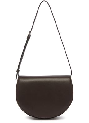 The Row's Canteen shoulder bag is a chic mini bag designed for versatility. It features a magnetic flap closure and visible topstitching, adding elegance to its structure. With a single handle and an adjustable thin strap, it can be hand carried or worn on the shoulder, perfect for any occasion.