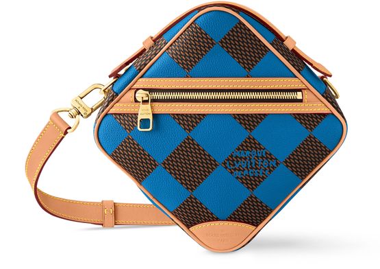 Creative Director Pharrell Williams was inspired by the House’s emblematic Damier checks to create the distinctive shape of this Chess Messenger bag in his new Damier Pop coated canvas. The bag incorporates other House design cues including natural leather trim, reinforced corners, and a top handle. The removable strap adjusts for cross-body carry.