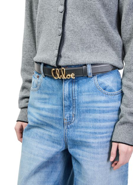 Reveal Chloe's tie belt, crafted from smooth leather and finished with an adjustable clasp. The brand's signature gold-tone hardware and logo in gold letters add a refined touch. This versatile accessory elevates any look, seamlessly transitioning from casual to formal with effortless sophistication.