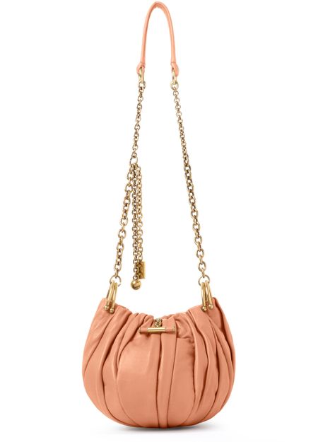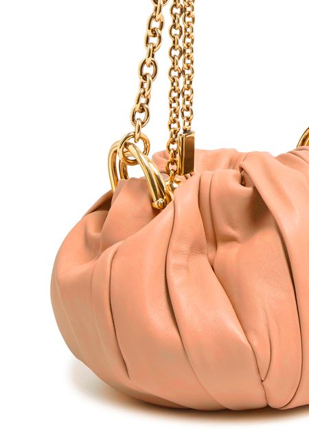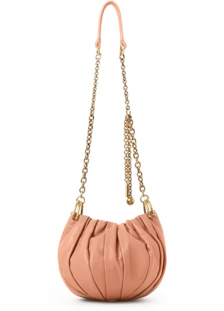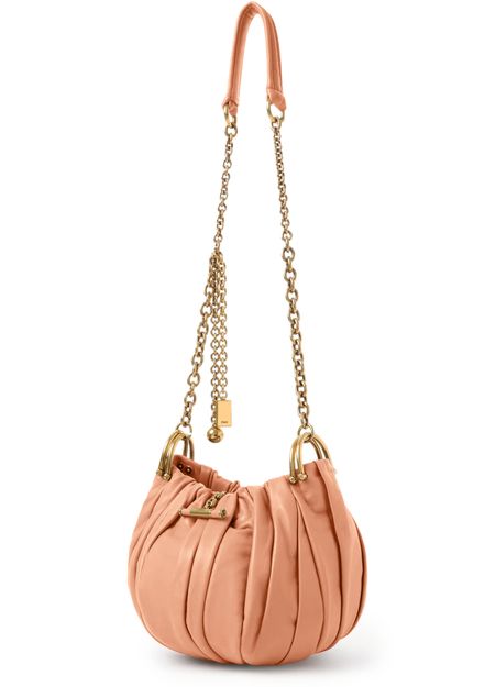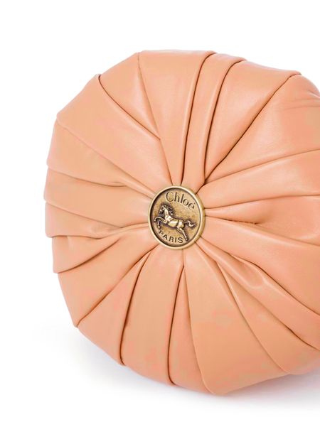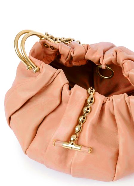 Reveal Chloé's plissé clutch bag, crafted from smooth leather and adorned with a gold finish. The single handle and chain strap offer versatile styling, while the refined silhouette embodies modern sophistication. This piece seamlessly blends elegance and practicality for a statement accessory.
