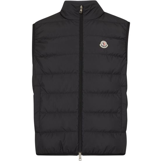 Moncler's Contrin jacket showcases a sleeveless gilet design with a high neck for added warmth. Featuring a front zipper closure, it combines style and functionality. The chest logo and appliquéd logo add a touch of sophistication, while the side pockets provide practicality. Its padded texture ensures comfort in any setting.