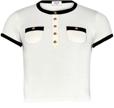 Introducing Celine's cropped t-shirt in cotton jersey, a staple for those who appreciate classic fit and elegance. This piece features a chic cropped length, a stylish crew neck, and two patch pockets on the chest accentuated with Celine Paris-engraved rivets. Contrast ribbed trim adds the perfect finishing touch.