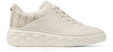 Reveal Jimmy Choo's Diamond Maxi sneakers, crafted from snakeskin print leather and smooth leather. These sneakers feature a closed round toe, platform heel, and thick outer sole. The laces and strap closure, along with visible stitching and an engraved logo, add a touch of sophistication.