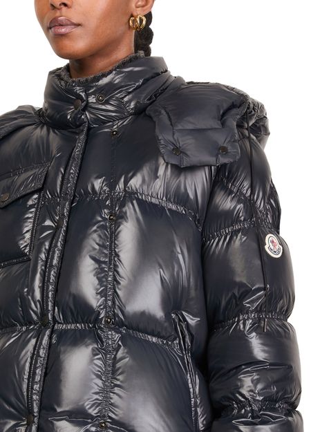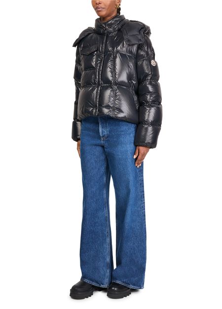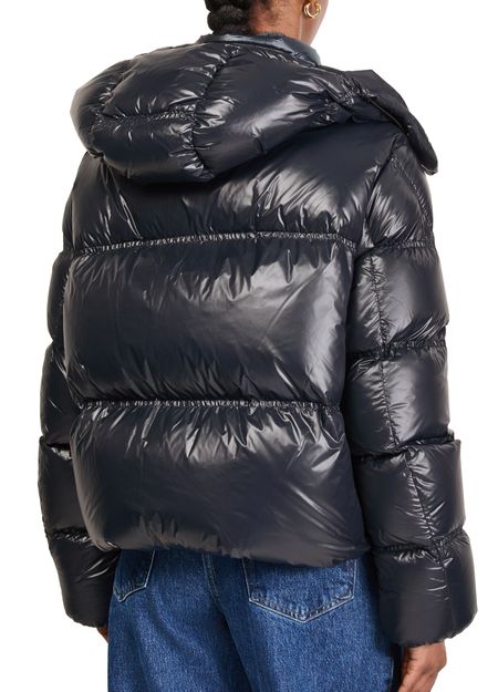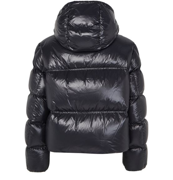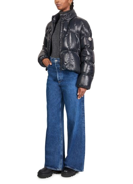 Introducing Moncler's Erea down jacket, a stylish piece crafted from glossed leather. This regular fit, cropped puffer jacket features a high neck and long sleeves for a modern silhouette. Its zipper closure and welt pockets offer practicality, while the padded texture and logo on the side add a touch of sophistication.