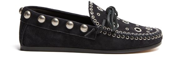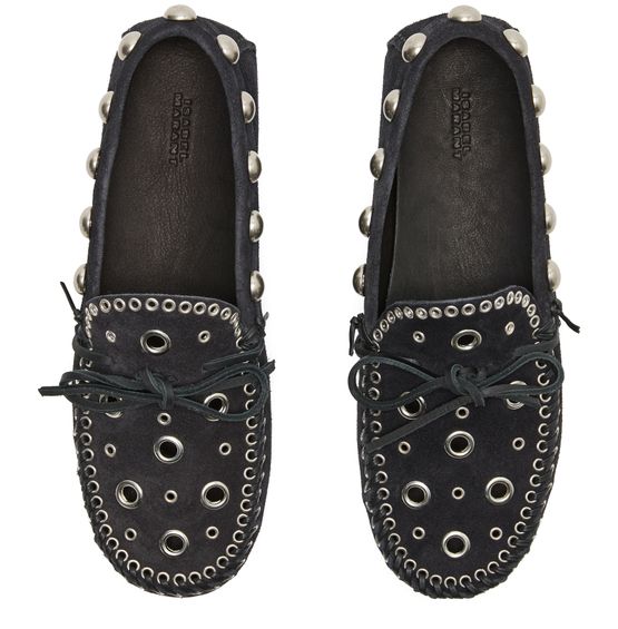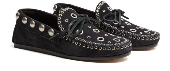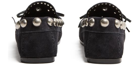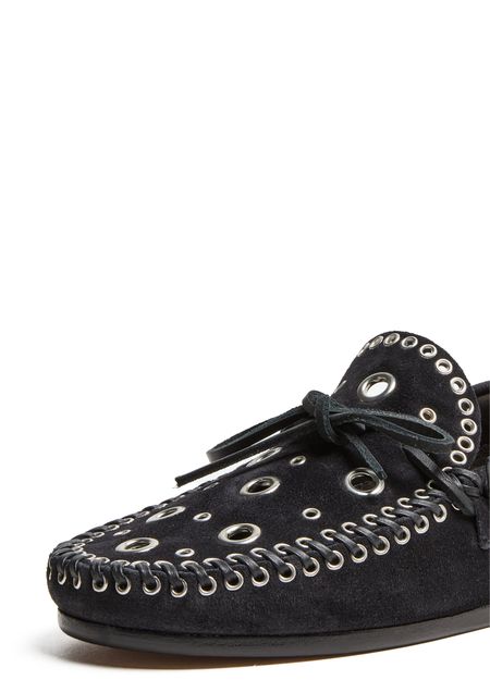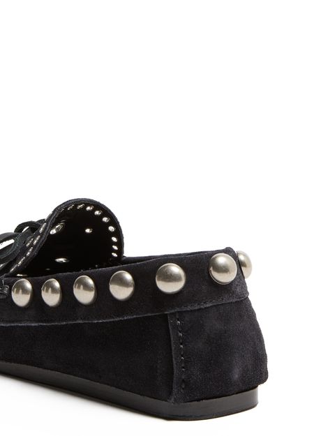 Reveal Isabel Marant's Fitza loafers, crafted from supple suede with a refined round toe and flat heel for all-day comfort. Laces and a strap ensure a secure fit, while visible stitching and studded silver finishes add a modern edge. An engraved logo completes this sophisticated pair.