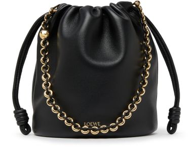 Loewe's Flamenco Purse Bucket bag is a chic hand-carried accessory made of mellow nappa lambskin. It features a front logo, drawstring closure, and a small bucket bag design for a trendy and versatile look.