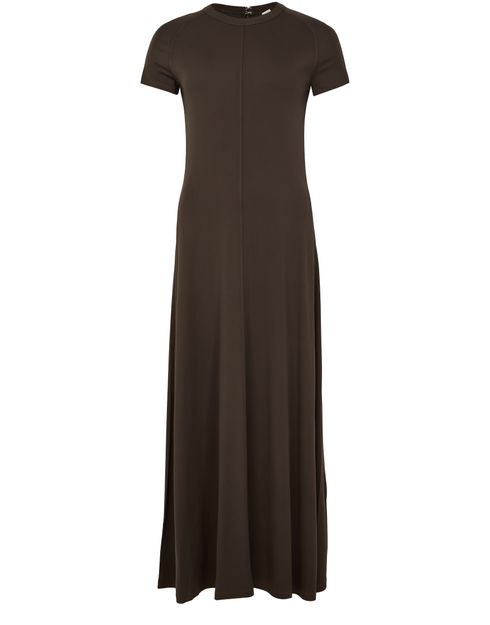 Toteme's Fluid jersey long dress showcases a short-sleeved silhouette, elegantly designed with a crew neck and a concealed back zipper closure. This midi dress features a flared shape, crafted from soft knitted fabric, adorned with visible stitching and an appliquéd logo, perfect for effortless style and comfort in any setting.