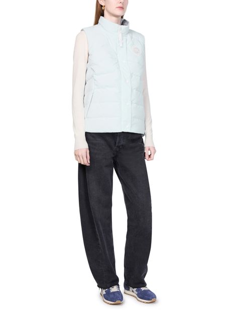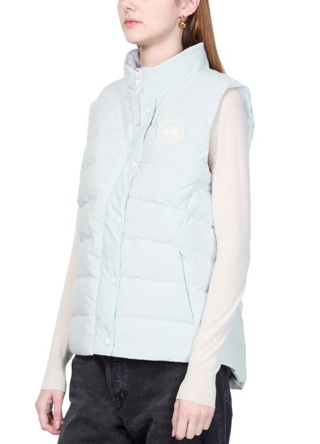 Canada Goose's Freestyle vest showcases a sleeveless design with a high neck for added warmth. Its front buttoned closure and padded texture provide comfort, while the front logo and appliquéd logo add a touch of style. With convenient side pockets, this short puffer jacket is perfect for layering.