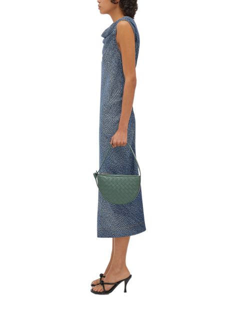 Bottega Veneta's Half-moon bag is a stylish mini bag with a handle for versatile carrying options. It features a zipper closure and a sleek silver finish. This bag can be worn in the hand or on the shoulder, making it a perfect accessory for any outfit or occasion.