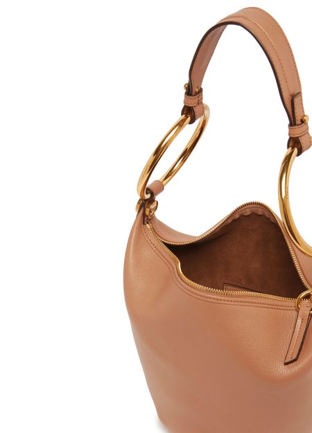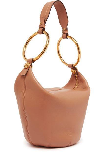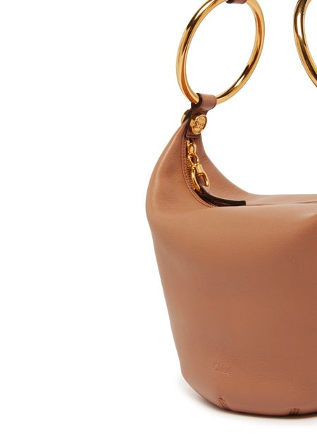 Chloé's Bracelet small shoulder bag showcases a stylish silhouette with a single compartment and a secure zipper closure. Its wide strap allows for comfortable shoulder wear, while the front logo and engraved details add a touch of elegance. The gold finish and visible topstitching enhance its luxurious appeal, making it a must-have accessory.