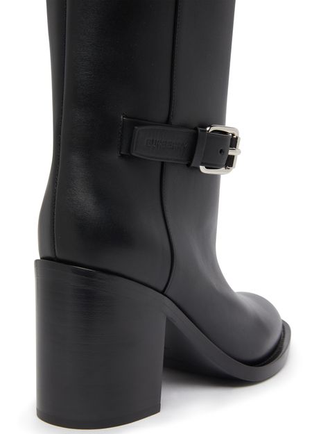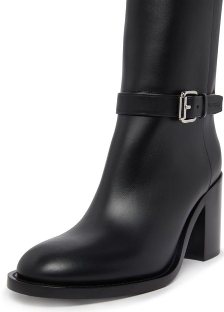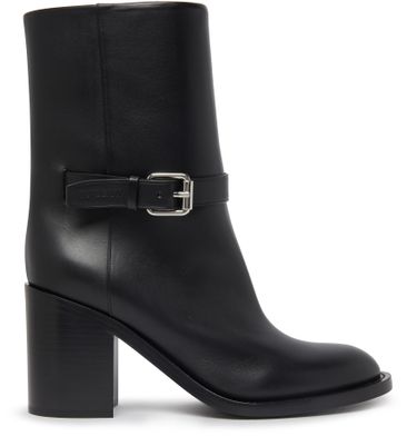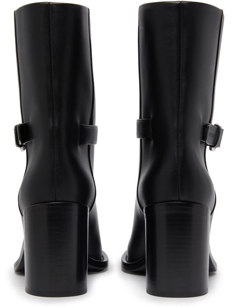 • Description : Smooth leather, pointed toe, sleek shape, high-top upper, buckled strap, silver finish, block heel.