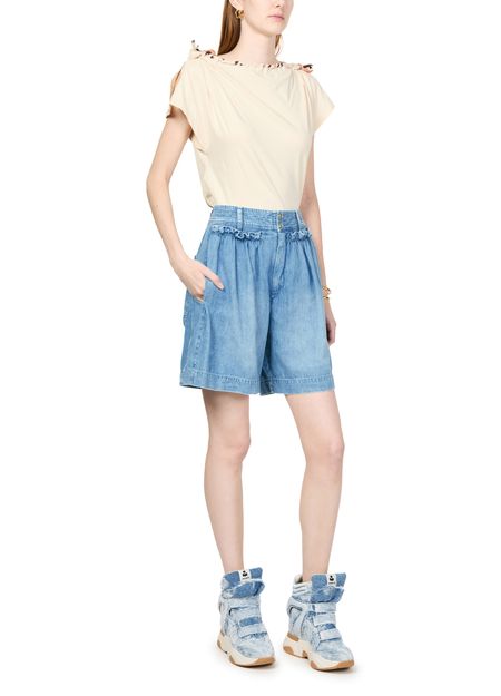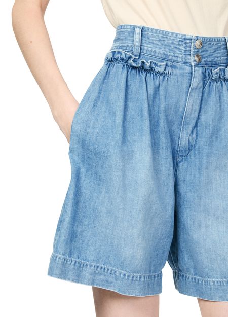 Isabel Marant's Ingrid denim shorts showcase a high-waisted fit with a belted waist for a flattering silhouette. Featuring a buttoned and concealed zipper closure, these shorts highlight visible stitching and back darts for added style. The back patch pocket adds functionality, while the short length ensures a chic summer look.