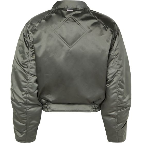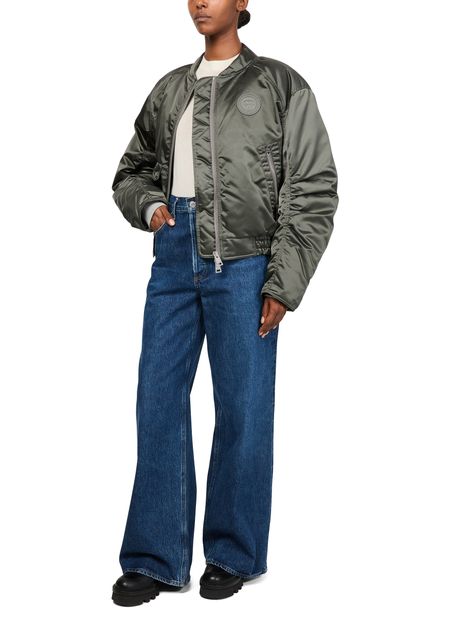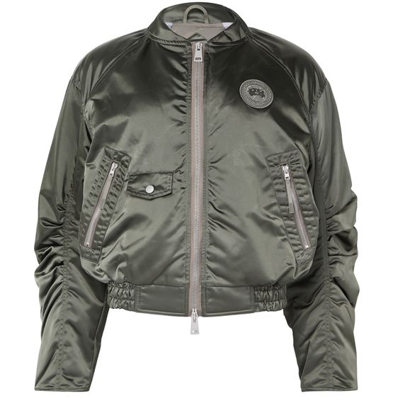 Introducing Canada Goose's Jade aviator jacket, a statement piece in oversized fit and short length. Crafted from smooth, satin-finish leather, it features a zipper closure, long sleeves, and a collarless design. The embroidered chest logo and practical flap and side pockets add a touch of sophistication.
