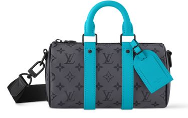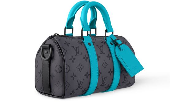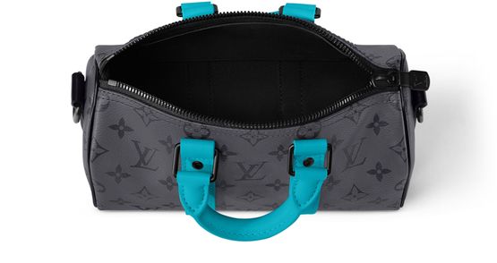 Monogram Eclipse Reverse canvas is paired with turquoise-color leather trim on this Keepall Bandoulière 25 city bag. The lateral reinforcement bands, top handles, and name tag all pop with vibrant color, giving an energetic feel to this compact bag. The matte-black hardware and black-color removable and adjustable textile strap complete the design.