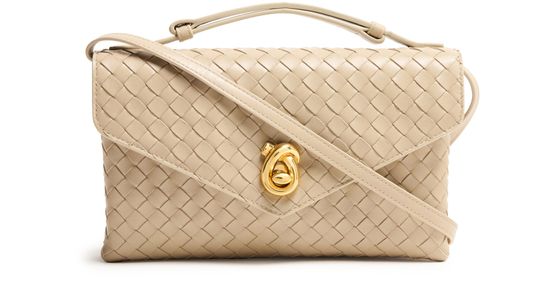 Unveil Bottega Veneta's Knot Lock crossbody bag - a masterpiece of modern elegance. Featuring an adjustable strap and double handles, this versatile bag can be hand carried or worn on the shoulder. The gold finish and twist lock closure highlight its sophisticated design, while the interior patch pockets add practicality.