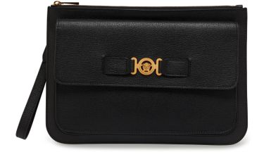Versace's Large pouch showcases exquisite craftsmanship with visible stitching and topstitching. Its sleek design features interior slots for cards, ensuring organization. The metallic logo on the front adds a touch of elegance, while the secure zipper closure keeps your essentials safe. Elevate your style with this luxurious accessory.