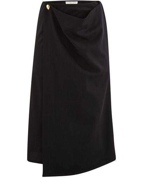The Liquid wool skirt is a Bottega Veneta design. This asymmetrically cut cross-over skirt is fastened with an elegant button at the waist.