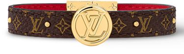 Characterized by iconic Monogram canvas and gold-color metal trunk studs, the LV Circle reversible bracelet pays homage to Louis Vuitton's history. Smooth and refined calf leather, along with a metallic clasp, creates a polished look. An LV Circle engraved on the front adds a final House hallmark to this design.