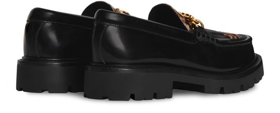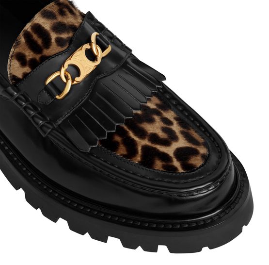 Description : 1.4 in (35 mm) heel, round toe shape, chunky Triomphe gold chain on the apron, hand-stitched apron, fringes, slip-on, leather insole, rubber lug outsole with tonal leather welt, celine signature debossed under the outsole, if you have a high arch, we recommend ordering a half size bigger.