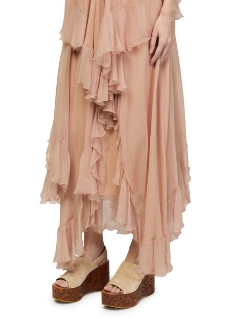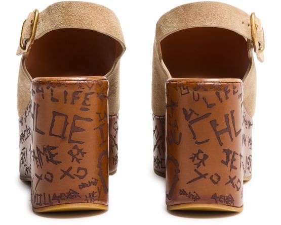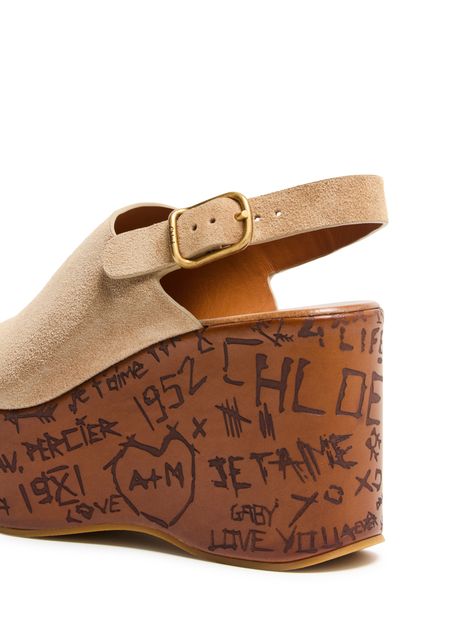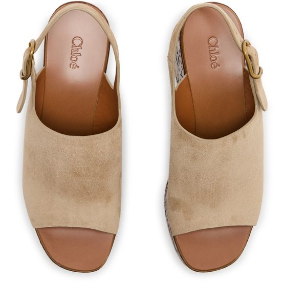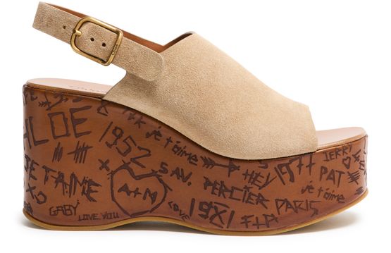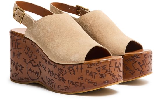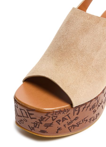 Reveal Chloe's suede platform sandals, designed with open toes and a buckled strap for a secure fit. The high heel and thick contrasting sole add bold elevation, while graphic cut-outs and a printed logo on the side showcase modern flair. Leather lining ensures comfort with every step.