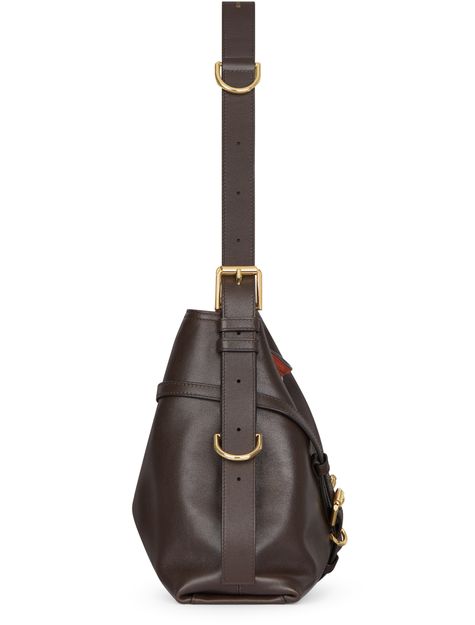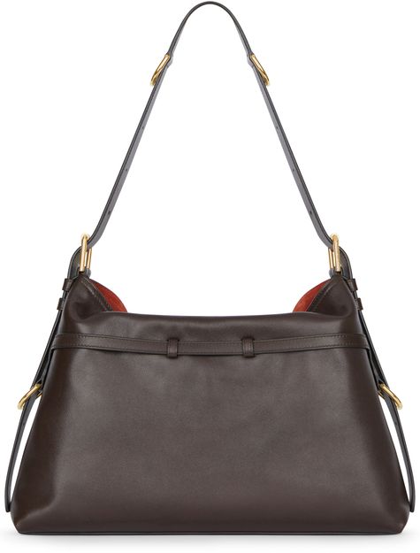 Unveil Givenchy's Medium Voyou bag in shiny leather, a sleek hobo design that encapsulates elegance. Crafted from smooth leather with a single handle, it features a flap closure, zippered interior pocket, and visible topstitching. Adorned with a front logo in gold letters, it exudes sophistication.