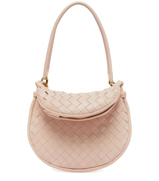 Bottega Veneta's Gemelli bag features a sleek and sophisticated design with a thin strap and single handle for versatile wear. Perfect for carrying essentials, this bag is worn on the shoulder and boasts a luxurious gold finish. The zipper closure ensures the security of your belongings in style.