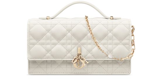 • Description : Front D.I.O.R. charm, flap closure, 2 interior compartments, rear patch pocket, 3 card slots, leather top handle, removable jewel chain.