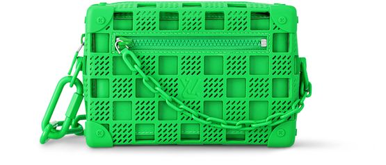 This unique Mini Soft Trunk is made entirely from recycled rubber and plastic. The production process consists of injecting recycled materials into a mold to create the two pieces that compose this Mini Soft Trunk. It’s signed with LV initials that incorporate the recycling symbol.