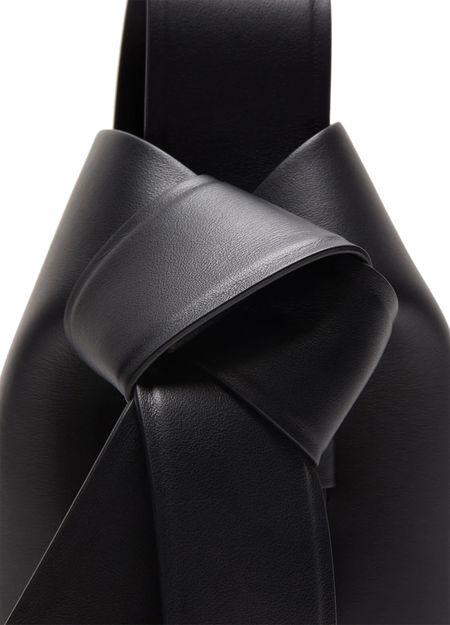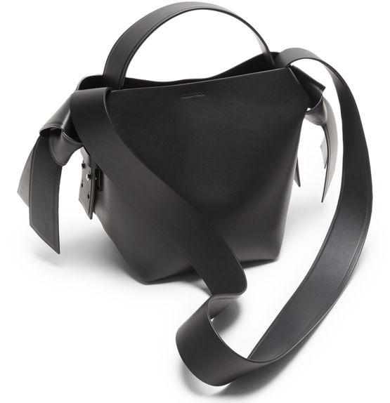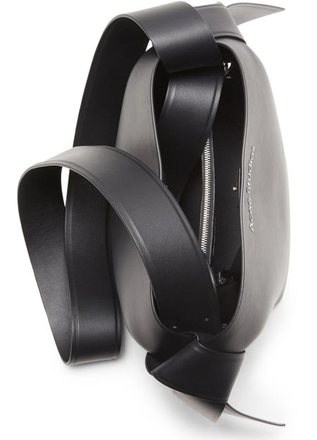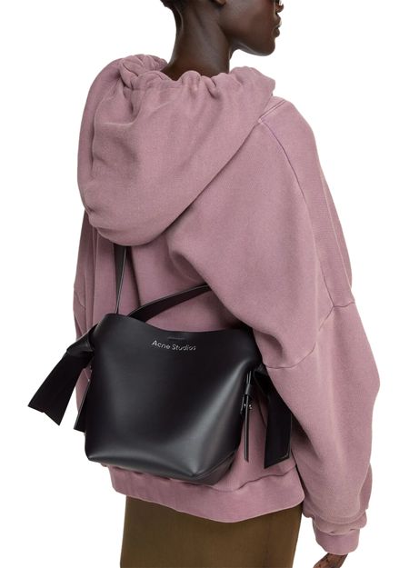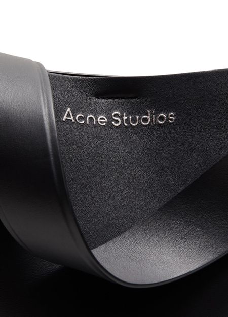 Acne's Musubi mini shoulder bag features a single compartment and a wide strap for wearing on the shoulder. The printed logo on the front is accented by silver lettering for a sleek, modern look. The silver finish adds a touch of sophistication to this stylish and versatile accessory.