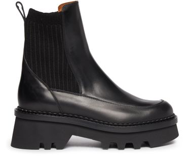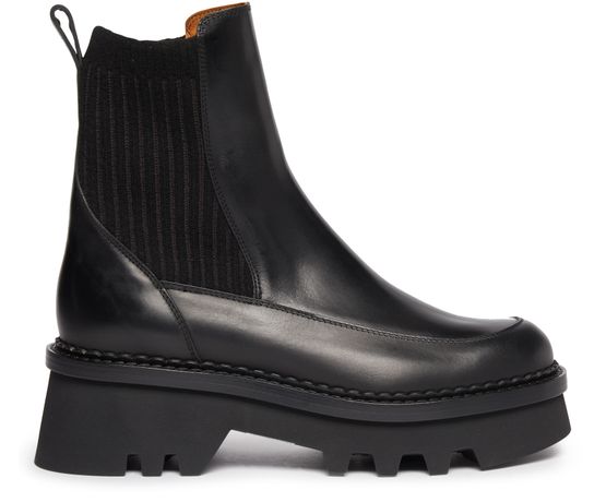 Chloe's Owena boots are made of smooth leather with a thick, notched sole and a square heel for a modern look. They feature elasticated sides and contrast details for added style. The boots also have a leather loop at the back for easy slipping on and off, and a pull-on design for convenience.