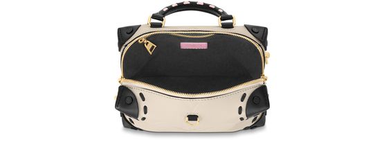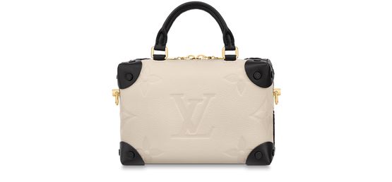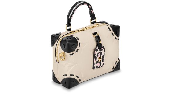 The Petite Malle Souple in Monogram Empreinte leather hails from the Fall 2021 Wild at Heart capsule. Key details include a braided top handle, echoing the stitches around the bag’s riveted corners, and a leopard-print tag with a cheeky touch of pink. The textile strap and gold-finished chain, both detachable, provide a host of chic styling options.