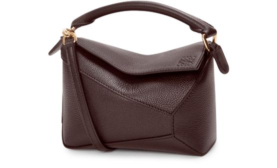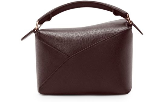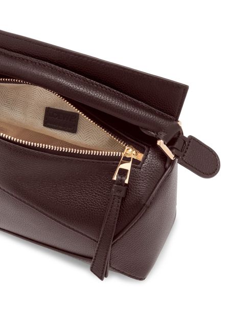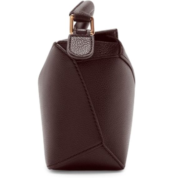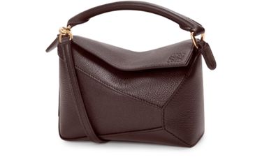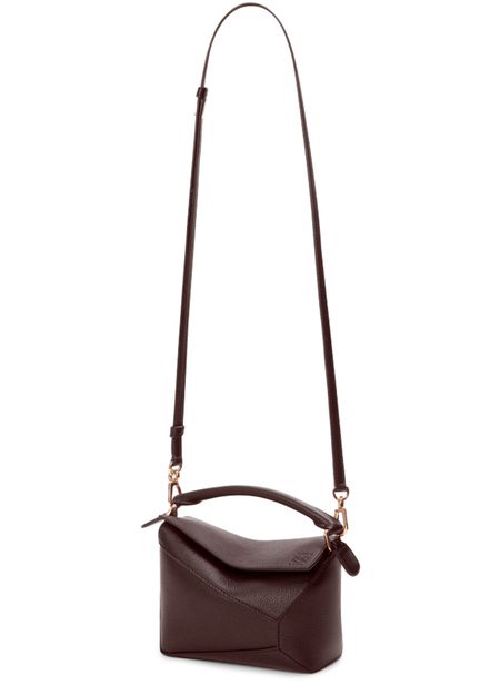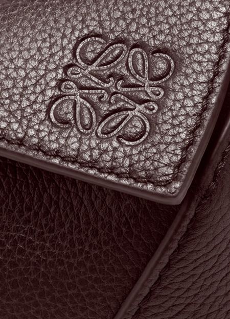 Reveal Loewe's Puzzle Edge mini bag, crafted from grained leather with a padded texture and gold finish. The adjustable, detachable thin strap and single handle offer versatile styling, while the embossed front logo and visible stitching highlight refined craftsmanship. A spacious interior compartment ensures everyday essentials stay organized.